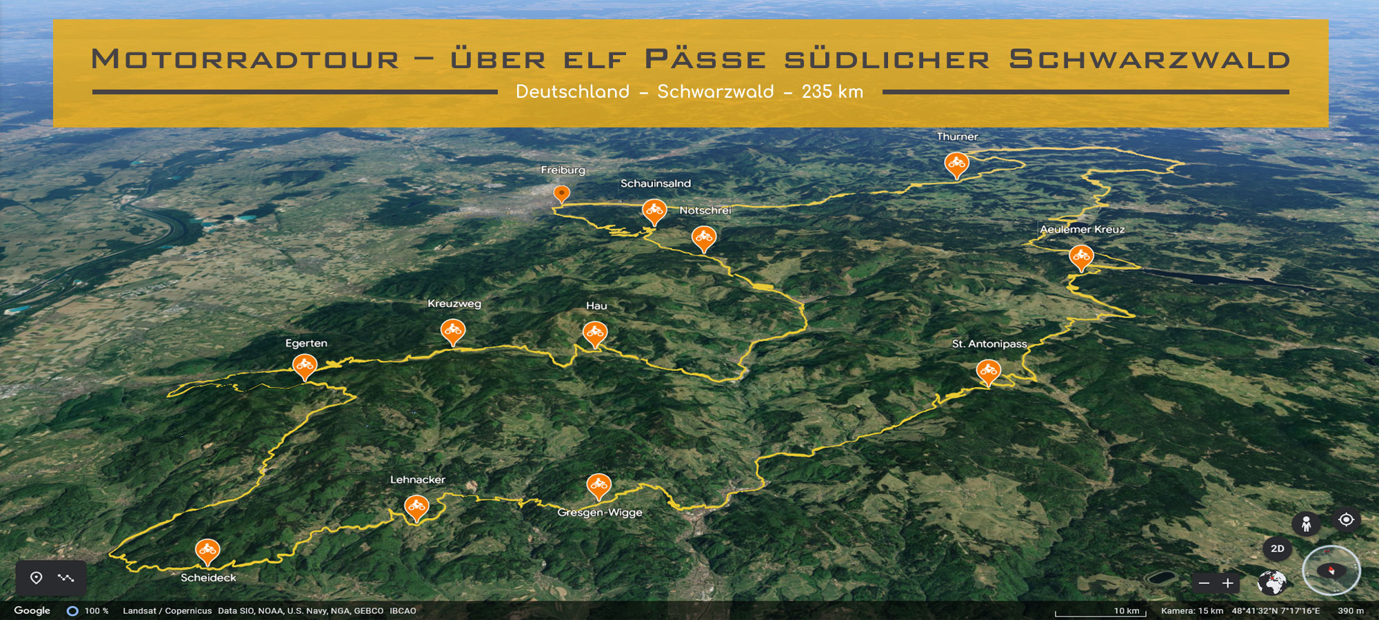 Auf dieser tollen Motorradtour kommst Du über elf unterschiedliche Pässe im südlichen Schwarzwald. Diese Motorradtour geht vorbei an Seen und Wasserfällen und bietet immer wieder eine fantastische Aussicht.